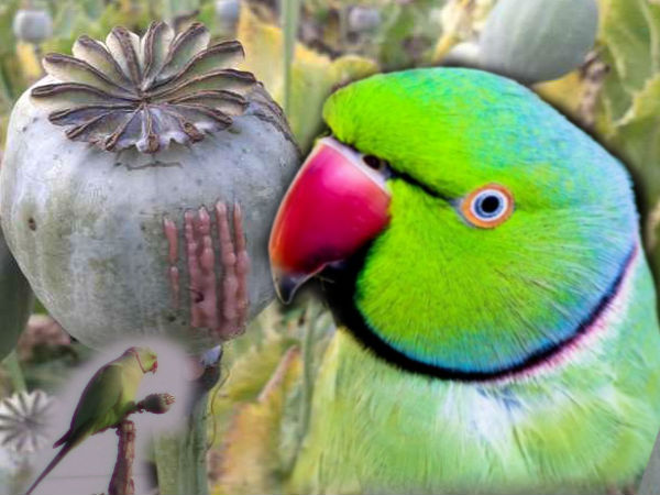 खेतों में अफीम की फसल देख कर तोतों के मुह में पानी भर आता है और ये खेतों के आसपास पेड़ों पर अपना डेरा जमा देते है। सुबह जल्दी ही किसानों के आने से पहले तोतों के झुण्ड के झुण्ड अफीम के खेतों में पहुँच जाते हैं और अफीम के डोडो को चट कर जाते हैं।