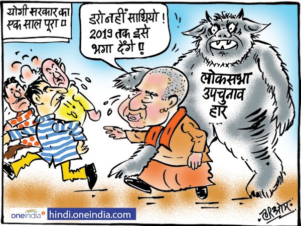 नई दिल्लीः आज योगी आदित्यनाथ को यूपी का मुख्यमंत्री बने एक साल हो गया है। भारतीय जनता पार्टी के नेता एक साल पूरा होने की खुशी मना रहे हैं वहीं उपचुनाव में हार एक साल के जश्न में बाधा की तरह देखी जा रही है। इसी को लेकर है हमारा आज का कार्टून-