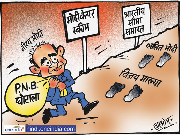 नई दिल्लीः पंजाब नेशनल बैंक में हजारों करोड़ रुपये के घोटाले की खबर ने सबको चौंका दिया। घटाले से भी बड़ी बात थी कि नीरव मोदी देश छोड़कर भाग चुके थे, वहीं उनसे पहले विजय माल्या और ललित मोदी भी देश छोड़ चुके हैं। इसी को लेकर है हमारा आज का कार्टून-
