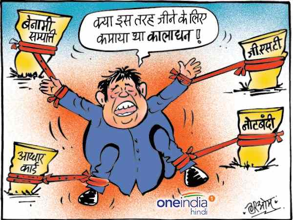 नई दिल्ली। केंद्र की मोदी सरकार ने काला धन रखने वालों पर शिकंजा कसने के लिए चौतरफा वार शुरू कर दिया है। नोटबंदी और जीएसटी के बाद बैंकों को आधार से लिंक और अब बेनामा संपत्ति पर लगाम लगने से काला धन कमाने वाले परेशान हो गए हैं। देखिए इसी पर आज का कार्टून।