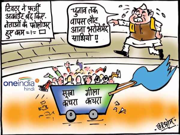 नई दिल्ली। फर्जी अकाउंट को लेकर ट्विटर ने सफाई अभियान छेड़ा तो देश के दिग्गज नेताओं के फॉलोअर्स में कमी आ गई। अभी तक जो फॉलोअर्स चुनावी नैया पार लगाने में साथ निभा रहे थे, वो अब नेताजी से दूर हो गए हैं। नेताजी टेंशन में हैं कि अगले चुनावी रण में उनका क्या होगा और इसीलिए अपने चहेतों को वापस बुलाने का रास्ता खोज रहे हैं। देखिए आज का कार्टून।