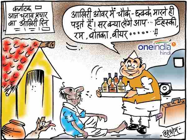 नई दिल्ली। कर्नाटक में चल रहे विधानसभा चुनाव में प्रचार का आखिरी दिन आ गया है। विकास के मुद्दों से शुरू हुआ चुनाव प्रचार निजी हमलों से होता हुआ अब वोटर की 'सेवा-पानी' तक आ पहुंचा है। अभी तक सिंगल-डबल रन बनाकर सियासी मैदान में डटे हुए नेताजी अब मैच यानी चुनाव प्रचार में चौके- छक्के लगाने के मूड में हैं। देखिए इसी पर आज का हमारा कार्टून।