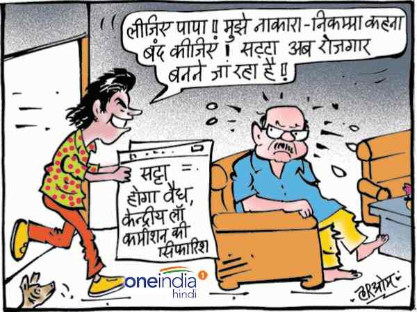 नई दिल्ली। केंद्रीय लॉ कमीशन (विधि आयोग) ने सिफारिश की है कि खेलों में सट्टेबाजी और जुए को वैध किया जाए। कानून मंत्रालय को सौंपी रिपोर्ट में आयोग ने कहा है कि सट्टेबाजी पर प्रतिबंध से काले धन और अपराध को बढ़ावा मिलता है। अब इस सिफारिश पर भले ही सियासी घमासान मचे लेकिन मोहल्ले के वो लड़के खुश हो गए हैं, जो जुए में मेहनत करने के बावजूद बेरोजगार कहलाते थे। देखिए आज का कार्टून।