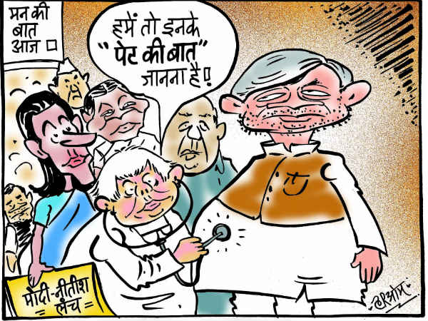 प्रधानमंत्री नरेंद्र मोदी ने रविवार को 32वीं बार 'मन की बात' कार्यक्रम के जरिये देश को संबोधित किया। लेकिन जो विपक्षी दल के नेता हैं वो पीएम के पेट की बात जानना चाहते हैं। इसी पर तंज कसता यह काटूर्न