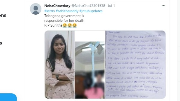 इस फोटो को सबसे पहले ट्विटर यूजर नेहा चौधरी (@NehaCho78701538) ने अपने हैंडल से पोस्ट किया। यह पोस्ट यूट्यूब पर भी वायरल है। जब वायरल हो रही इस फोटो की सत्यता जांची गई तो पता चला कि पोस्ट में दिख रही लड़की का नाम संकीर्तना है और वो जिंदा है। संकीर्तना ने खुद इस बात की पुष्टि की कि ये पोस्ट फर्जी है। उन्होंने बताया कि वो बी-टेक की छात्रा नहीं है, बल्कि दिल्ली विश्वविद्यालय से बीकॉम (ऑनर्स) कर रही हैं। आपको बता दें कि तेलंगाना के जवाहरलाल नेहरू प्रौद्योगिकी विश्वविद्यालय (JNTU) के कई छात्र 2 जुलाई से ऑफलाइन परीक्षा आयोजित करने के विश्वविद्यालय के फैसले का विरोध कर रहे थे।