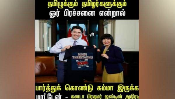 नई दिल्ली। सोशल मीडिया पर इन दिनों एक तस्वीर तेजी से वायरल हो रही है। जिसमें ये दावा किया जा रहा है कि कनाडा के प्रधानमंत्री जस्टिन ट्रूडो ने तमिलनाडु के हिंदी विरोधी आंदोलन का समर्थन किया है। इस तस्वीर में ट्रूडो के हाथ में एक टीशर्ट दिखाई दे रही है, जिसपर लिखा है, 'Hindi theriyathu poda'। इस सोशल मीडिया पोस्ट में ये दावा किया गया है कि जस्टिन ट्रूडो तमिलनाडु में हो रहे हिंदी विरोधी आंदोलन का समर्थन कर रहे हैं। इस पोस्ट में ट्रूडो का नाम लेते हुए ये भी लिखा है, 'अगर तमिलों की कोई समस्या है तो मैं चुप नहीं रह सकता।'