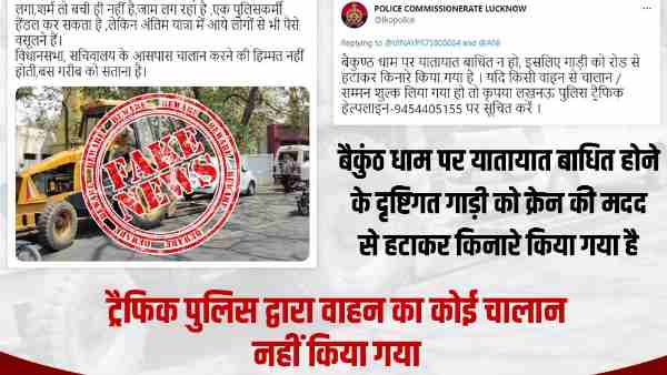 दरअसल, सोशल मीडिया पर एक तस्वीर तेजी से वायरल हो रही है, जिसमें ट्रैफिक पुलिस क्रेन की मदद से एक कार को उठाते हुए दिखाई दे रही है। इस तस्वीर को सोशल मीडिया पर वायरल कर दावा किया जा रहा है कि श्मशान घाट पर खड़ी गाडियों का ट्रैफिक पुलिस द्वारा चालान किया गया है। हालांकि, सोशल मीडिया पर वायरल हो रही इस तस्वीर पर उत्तर प्रदेश पुलिस के साथ ही, उत्तर प्रदेश फैक्ट चेक विंग ने सफाई दी है। उत्तर प्रदेश फैक्ट चेक विंग ने कहा कि तस्वीर के साथ चालान काटने का जो दावा किया जा रहा है वो गलत है। ये पोस्ट लोगों को गुमराह करने के लिए सोशल मीडिया पर वायरल की जा रही है।