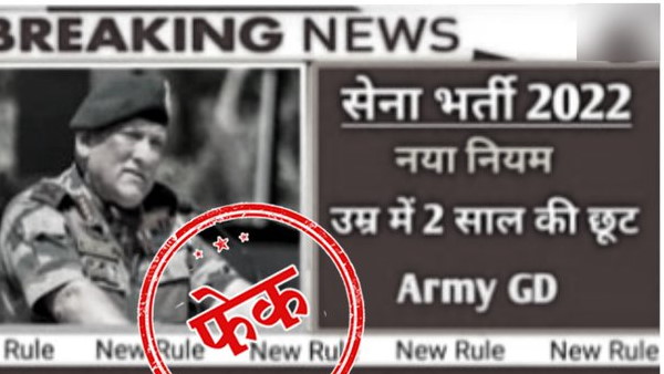 वायरल फोटो को कई सोशल मीडिया प्लेटफार्म पर शेयर कर दावा किया जा रहा है कि भारतीय आर्मी ने सेमा भर्ती 2022 के लिए नए नियम जारी करते हुए आवेदनकर्ता की उम्र में 2 साल की छूट दी है। फोटो में सीडीएस बिपिन रावत की फोटो के साथ ब्रेकिंग न्यूज लिखा हुआ है। इंटरनेट पर इस तस्वीर में किए गए दावों को सच मानकर कई युवा तरह-तरह के सवाल कर रहे हैं, लेकिन सच तो ये है कि ना ही भारत सरकार की तरफ से और ना ही भारतीय सेना की ओर से ऐसा कोई नियम जारी किया गया है।