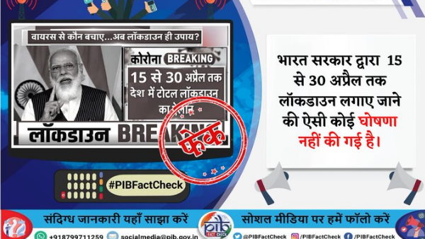 पीआईबी ने एक ट्वीट में लिखा है, एक Morphed तस्वीर में दावा किया जा रहा है कि भारत सरकार द्वारा 15 से 30 अप्रैल तक देश भर में लॉकडाउन लगाया जाएगा। पीआईबी के मुताबिक, यह दावा फर्जी है। भारत सरकार द्वारा लॉकडाउन के संबंध में ऐसी कोई घोषणा नहीं की गई है। कृपया ऐसी भ्रामक तस्वीरों या संदेशों को साझा न करें।