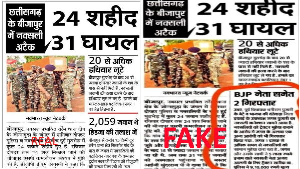 कई फ़ेसबुक यूजर्स ने सैनिकों के शव ले जाते हुए एक हिंदी अखबार का स्क्रीनशॉट पोस्ट किया है, जिसमें लिखा है, "छत्तीसगढ़ के बीजापुर में नक्सली हमले में 24 शहीद, 31 घायल। इसी खबर के नीचे साइड में एक और खबर छपी हुई है। जिसमे लिखा गया है कि, बीजेपी नेता समेत दो गिरफ्तार। सोशल मीडिया पर यूजर्स इस अखबार की क्लिप को जमकर अलग-अलग शीर्षक से शेयर कर रहे हैं।