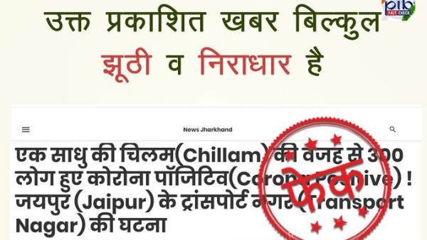 जिला कलेक्टर ने स्पष्ट किया है कि इस जगह ऐसी कोई घटना नहीं हुई है। ये खबर फर्जी और निराधार है। ऐसी खबरों पर विश्वास न करें क्योंकि इनका मकसद केवल लोगों को चिंता में डालना होता है। इस खबर को लेकर पीआईबी फैक्ट चेक ने पीआईबी झारखंड के एक ट्वीट को रीट्वीट किया है। जिसमें लिखा है, 'न्यूज पोर्टल 'न्यूज झारखंड' ने दावा किया है की जयपुर के ट्रांसपोर्ट नगर क्षेत्र में एक साधु की चिलम के कारण 300 लोगों में कोरोना फैला है। पीआईबी फैक्ट चेक- जिला कलेक्टर, जयपुर के अनुसार प्रकाशित खबर की कोई सत्यता नहीं है व ऐसी कोई घटना घटित नहीं हुई है।'