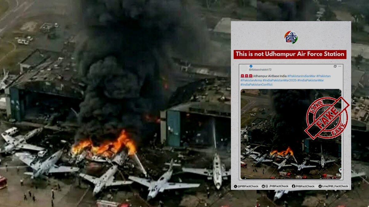 सोशल मीडिया पर वायरल हो रही उधमपुर एयरबेस पर आगजनी की तस्वीर और उससे जुड़ा दावा पूरी तरह गलत और भ्रामक है। PIB Fact Check ने साफ कर दिया है कि यह तस्वीर न तो उधमपुर एयरफोर्स स्टेशन की है और न ही भारतीय वायुसेना के किसी विमान की।