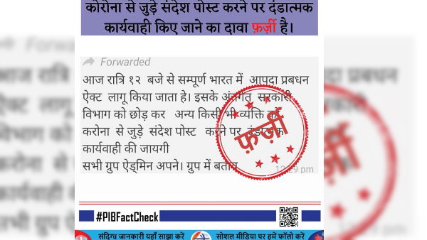 सोशल मीडिया पर वायरल हो रहे व्हाट्सऐप मैसेज में दावा किया जा रहा है कि, आज रात्रि 12 बजे से सम्पूर्ण भारत में आपदा प्रबधन ऐक्ट लागू किया जाता है। इसके अंतर्गत सरकारी विभाग को छोड़ कर अन्य किसी भी व्यक्ति को करोना से जुड़े संदेश पोस्ट करने पर दंडात्मक कार्यवाही की जाएगी। पीआईबी फैक्ट चेक टीम ने इस दावे की सत्यता की जांच की है। पीआईबी फैक्ट चेक टीम ने ट्वीट कर बताया है कि, इस मैसेज में किया गया दावा फर्जी है।