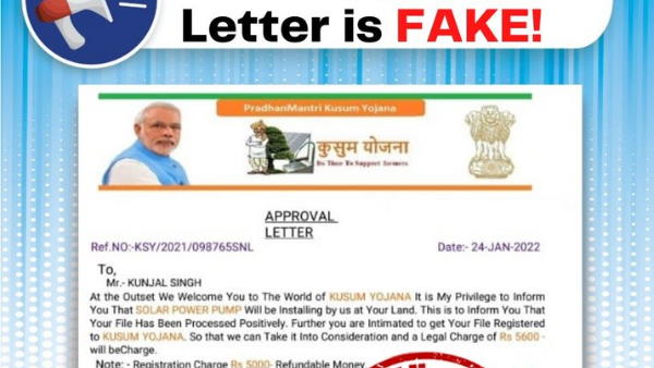 पीआईबी की फैक्ट चैक साइट ने अपने ट्वीट में बताया है कि प्रधानमंत्री कुसुम योजना के तहत जारी एक अप्रूवल पत्र में सोलर पंप स्थापित करने के लिए 5,600 रुपए लीगल फीस और 5,000 रुपए अतिरिक्त पंजीकरण शुल्क के रूप में मांगा गया है। यह पत्र पूरी तरह से फर्जी है। केंद्र सरकार की ओर से ऐसा कोई अनुमोदन पत्र जारी नहीं किया गया है, ऐसे में इस पर विश्वास ना करें और इसे शेयर ना करें।