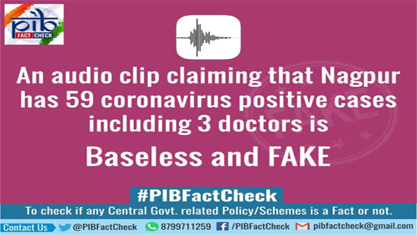 नई दिल्ली। जैसे-जैसे देश में कोरोना वायरस के संक्रमण के मामले बढ़ रहे हैं, उतनी ही तेजी से कोरोना वायरस को लेकर अफवाह और फेक खबरों का सिलसिला भी बढ़ रहा है। सोशळ मीडिया पर कोरोना वायरस को लेकर कई फेक खबरें वायरल हो रही है। सोशल मीडिया पर ऐसा ही एक ऑडियो मैसेज वायरल हुआ, जिसमें दावा किया जा रहा है कि महाराष्ट्र के नागपुर में अब तक 59 कोरोना के पॉजिटिव मामले सामने आ चुके हैं।