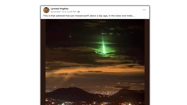 वायरल हो रही फोटो पहाड़ों से ली गई है। जिसमें चारों ओर शहर की लाइटें नजर आ रहीं, जबकि आसमान में एक हर रंगे की रोशनी दिख रही। आमतौर पर ऐसी घटना को हम तारे टूटना कहते हैं। फोटो पोस्ट करने वाले ने लिखा कि ये एक स्टेरॉयड है, जो पृथ्वी से टकराने से बचा। ये घटना भारत की है। इसके बाद तेजी से लोगों ने इसको शेयर किया। साथ ही बड़ी घटना के टलने पर भगवान का शुक्र मनाया। बहुत से लोग ऐसे भी हैं, जो बता रहे कि भविष्य में दोबारा ऐसी घटना हो सकती है।