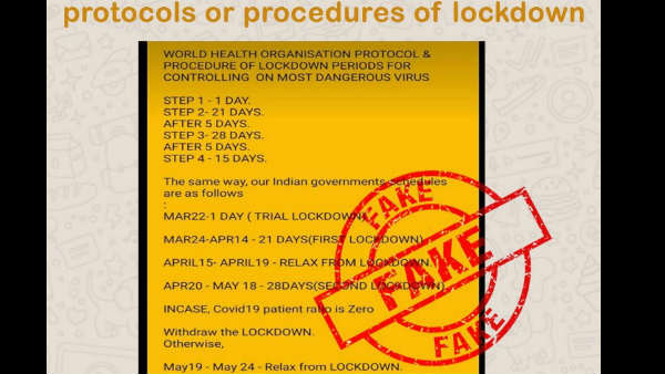 जो मैसेज फेसबुक और फिर धीरे-धीरे व्हाट्एसएप पर वायरल हुआ था उसमें कहा गया था डब्लूएचओ की तरफ से लॉकडाउन का शेड्यूल जारी किया गया है। इस मैसेज में कहा गया था कि संगठन ने लॉकडाउन को चार चरणों में बांटा है और भारत सरकार इसका ही पालन कर रही है। मैसेज के मुताबिक पहले चरण्ण में एक दिन का लॉकडाउन होगा और फिर इसके बाद 21 दिनों के लॉकडाउन वाला दूसरा फेज शुरू होगा। इसमें पांच दिनों की ढील दी जाएगी। पांच दिनों की ढील के बाद लॉकडाउन का तीसरा फेज शुरू होगा जो 28 दिनों का होगा। इसके बाद इसमें फिर से पांच दिनों की ढील दी जाएगी। फिर आखिरी चरण होगा जो कि 15 दिनों का होगा।