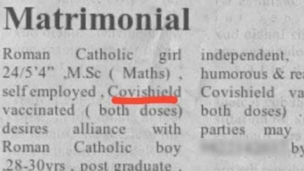 कांग्रेस नेता शशि थरूर समेत हजारों लोगों ने मैसेज शेयर किया है। 4 जून, 2021 के इस विज्ञापन में लड़की की ओर से अपनी हाइट, रंग और शिक्षा को लेकर जानकारी देने के बाद लिखा गया है कि उसे कोविशील्ड की दोनों डोज लग चुकी है। उसे वही लड़का शादी के लिए प्रपोजल भेजे जिसने कोविशील्ड की दोनों खुराक ले ली हों।