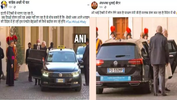 सोशल मीडिया पर शेयर करते हुए लिख रहे हैं कि, 'पीएम मोदी को इटली में टैक्सी से चलना पड़ रहा है। जब विपक्षी होकर हमें यह अच्छा नहीं लग रहा तो सोच सकते हैं कि बेचारे भक्त अपने भगवान की विदेश में हो रही इस घनघोर बेइज्जती को कैसे बर्दाश्त कर रहे होंगे।' एक अन्य तस्वीर में मोदी काले रंग की वोक्सवैगन कार के सामने खड़े हैं। गाड़ी की नंबर प्लेट के नीचे नीले रंग के बोर्ड पर 'ला प्राइमा ऐप इन इटालिया प्रति आई टैक्सी' लिखा हुआ है। बोर्ड के ऊपर टैक्सी का एक लोगो भी है - एक कैब सेवा ऐप का।
