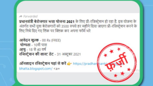 वायरल हो रहे मैसेज में लिखा है, 'प्रधानमंत्री बेरोजगार भत्ता योजना 2021 के लिए प्री-रजिस्ट्रेशन हो रहा है, इस योजना के अंतर्गत सभी युवा बेरोजगारों को 3500 रुपए हर महीने दिया जाएगा। प्री-रजिस्ट्रेशन करने के लिए नीचे दिए गए लिंक पर क्लिक कर अपना फॉर्म भरें। आवेदन शुल्क- फ्री, योग्यता- 10वीं पास, आयू- 18 से 40 वर्ष, रजिस्ट्रेशन की लास्ट डेट- 31 अक्टूबर, 2021।' वायरल दावे के साथ एक लिंक भी शेयर किया गया है जिस पर क्लिक करने से एक फॉर्म खुलकर आता है।