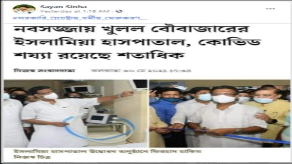 वायरल इमेज में जो हेडलाइन और इमेज का इस्तेमाल हुआ है उसकी जांच करने पर पता चला कि इस लेख को आनंद बाजार पत्रिका ने 30 मई, 2021 को प्रकाशित किया था। अस्पताल के महासचिव और कोलकाता नगर निगम के प्रशासक मंडल के सदस्य अमीरुद्दीन ने एक अखबार को बताया कि, 'कोई भी कोविड रोगी, चाहे वह किसी भी जाति, धर्म या वर्ग से संबंध रखता हो अस्पताल में अपना इलाज करा सकता है।'