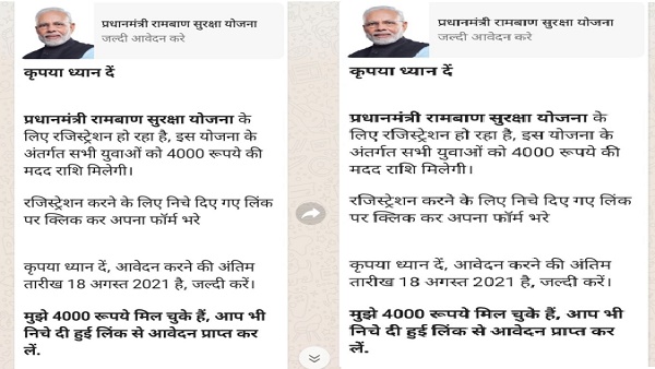 नई दिल्ली, अगस्त 18। वाट्सएप पर पिछले कई दिनों से एक मैसेज तेजी से वायरल हो रहा है, जिसमें दावा किया जा रहा है कि केंद्र सरकार ने प्रधानमंत्री रामबाण सुरक्षा योजना की शुरुआत की है। इस योजना के तहत युवाओं को 4000 रुपए की आर्थिक मदद मिलने का दावा किया जा रहा है। साथ ही मैसेज के साथ एक लिंक शेयर हो रहा है, जिसको लेकर कहा जा रहा है कि इस लिंक पर क्लिक करके आप योजना का लाभ उठा सकते हैं।