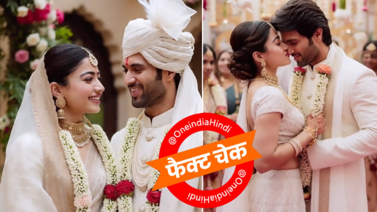 Rashmika Mandanna Vijay Deverakonda Marriage Fact Check: एक्ट्रेस रश्मिका मंदाना और विजय देवरकोंडा की 'शादी' की तस्वीरें सोशल मीडिया पर तेजी से वायरल हो रही हैं। इन फोटोज में रश्मिका दुल्हन के लहंगे में, विजय शेरवानी में, और बैकग्राउंड में महेश बाबू, नम्रता शिरोडकर और प्रभास जैसे सितारे आशीर्वाद देते नजर आ रहे हैं। फैंस उत्साहित हैं।