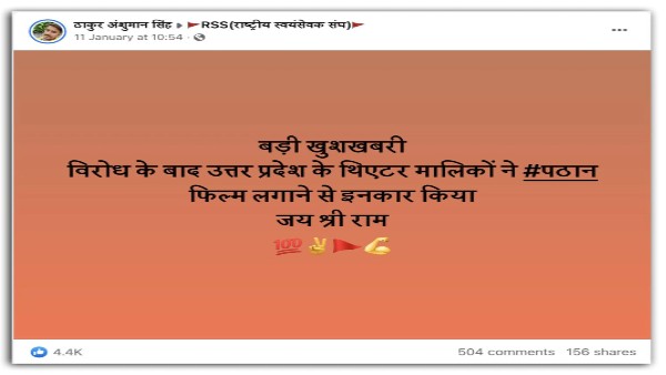 सोशल मीडिया पर पिछले कई महीनों से अभिनेता शाहरुख खान की आने वाली फिल्म 'पठान' को लेकर बॉयकॉट ट्रेंड चल रहा है। कई हिंदू और मुस्लिम संगठनों ने मूवी के विरोध में प्रदर्शन कर रहे हैं। यहां तक की फिल्म के पोस्टर तक जलाए गए हैं। फिल्म के खिलाफ प्रदर्शन की गुजरात, मध्य प्रदेश, राजस्थान और उत्तर प्रदेश सहित कई राज्यों से खबरें आई हैं। इस बीच कई पोस्ट में दावा किया जा रहा है कि उत्तर प्रदेश के थिएटर मालिकों ने फिल्म 'पठान' को दिखाने से इनकार कर दिया है।