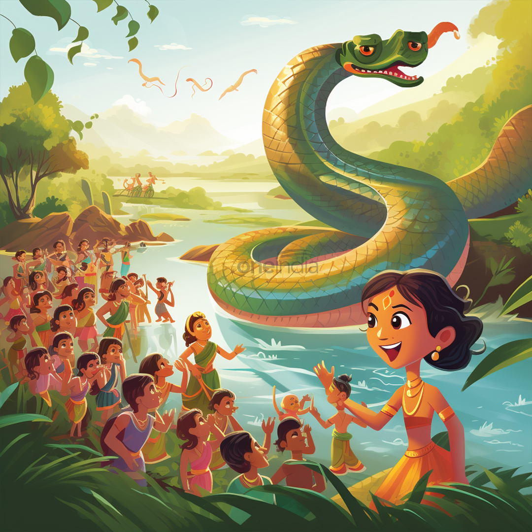 कालिया नाग को हराकर कृष्ण ने उसे वश में कर लिया, जिसने यमुना नदी को प्रदूषित किया था। इस घटना ने कृष्ण की दिव्य शक्तियों पर प्रकाश डाला।