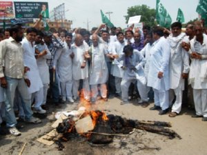 हिसार में दिखाई ताकत: हिसार में भी ट्रस्ट को जमीन देने के विरोध में जोरदार प्रदर्शन किया गया। इनेलो कार्यकर्ता सुबह 9 बजे से कटला रामलीला में में एकत्रित हुए। जिलाध्यक्ष उमेद लोहान के नेतृत्व में पूरे जोश व खरोश के साथ प्रदर्शन की शुरूआत की गई। इनेलो का हुजुम सड़कों से गुजरा तो सारा यातायात ठप हो गया। प्रदर्शनकारियों ने रास्ते में नागोरी गेट, पारीजात चौक व अग्रसेन भवन चौक पर जाम लगाकर मुख्यमंत्री भूपेन्द्र सिंह हुड्डा व राजीव गांधी ट्रस्ट के सर्वेसर्वा राहुल गांधी के पुतले भी फूंके व नेताओं ने भाषणबाजी की। पुतलों के गलों में जूतों की माला भी पहनाई गई थी।