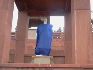 गार्ड ने उन लोगों को वहां से जाने को कहा लेकिन उन्होंने गार्ड को आश्वासन दिया कि वह सिर्फ फोटो ले रहे है इसी बीच चारों शरारती तत्व ऊपर चढ़े और अपने बैग से हथौड़ा निकाला तथा मूर्ति को तोड़ दिया। गार्ड उन लोगों को पकड़ पाता कि वह लोग और मीडियाकर्मी मौके से भाग निकले।