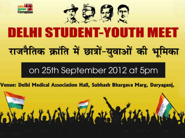 दिल्ली के दरयागंज के सुभाष भार्गव मार्ग पर स्थित 25 सितंबर को दिल्ली मेडिकल हॉल मे इंडिया अगेंस्ट करप्शन के तत्वावधान में दिल्ली छात्र-युवा सम्मेलन का आयोजन किया जा रहा है। इस सम्मेलन में केजरीवाल की नई पार्टी के गठन में युवाओं की भूमिका पर चर्चा की जायेगी।