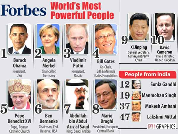 फोर्ब्स का कहना है कि मनमोहन सिंह सिंह ऑक्सफोर्ड और कैम्ब्रिज में पढ़ने वाले अर्थशास्त्री हैं और वह भारत के आर्थिक सुधारों के रचनाकार हैं। सिंह पिछले साल इस सूची में 19वें स्थान पर थे। फोर्ब्स ने कहा कि लेकिन सिंह के शांत बुद्धिवाद को लगातार कमजोरी और संकोचशील के तौर पर देखा गया है। अंबानी इस सूची में 37वें स्थान पर है। फोर्ब्स ने कहा है कि अंबानी भारत के सबसे अमीर व्यक्ति हैं। वहीं लक्ष्मी मित्तल को 47वें स्थान पर रखा गया है। मालूम हो कि पिछले साल उन्होंने 2012 टार्च रिले में ओलिंपिक मशाल थामी थी।