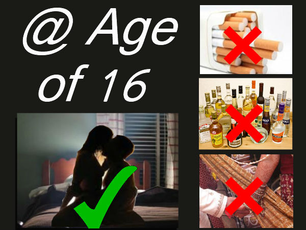 मजेदार बात तो देखिये यही कानून कहता है कि शादी के लिये लड़के की उम्र 21 साल से और लड़की की 18 से कम नहीं होनी चाहिये। यानी हमारा कानून अब साफ संकेत दे रहा है कि हमानी आने वाली जैनरेशन शादी से पहले यौन संबंध स्थापित कर सकेगी। मजेदार बात यह है कि बाकी के कानून पर सरकार कोई बदलाव नहीं करने जा रही है। जैसे बार में बैठकर शराब पीने की न्यूनतम उम्र 18 वर्ष, शराब, सिगरेट आदि खरीदने की न्यूनतम उम्र 18 साल, सिनेमा हॉल में एडल्ट फिल्म देखने के लिये कम से कम 18 का होना जरूरी है। आप सोचिये हमारे 16 साल के किशोर-किशोरियां एडल्ट फिल्म नहीं देख सकते हैं, लेकिन सेक्स कर सकते हैं। इस पर सूचना एवं प्रसारण मंत्री रेणुका चौधरी कहती हैं, "हमारे देश के बच्चे अब इतने समझदार हो गये हैं, कि उन्हें पता है कि उन्हें कब क्या करना है। लिहाजा मुझे इस कानून में कोई कमी नहीं दिखाई देती।"