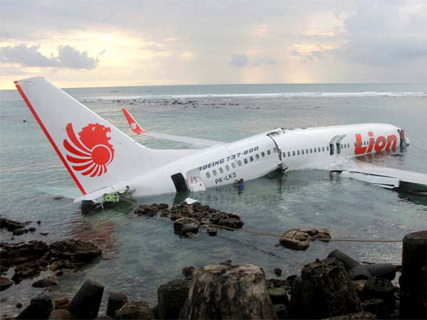 यह तस्वीर इंडोनेशियन पुलिस द्वारा उपलब्ध करवाई गयी है। जिसमें एक प्लेन बाली के एयरपोर्ट के पास पानी में हैं।
