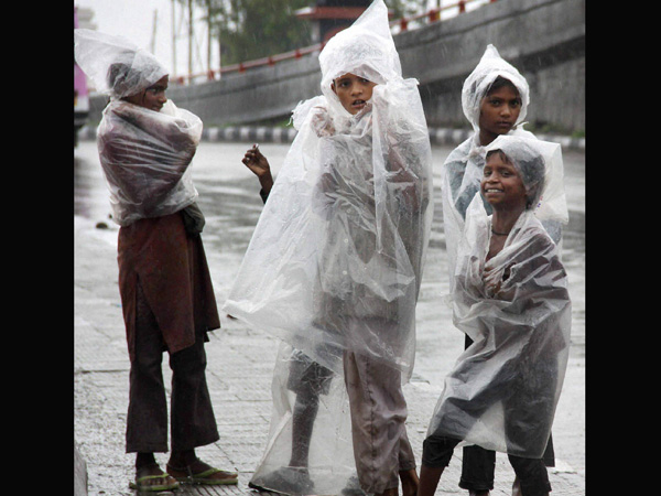 अपने आप को प्लास्टिक शीट से ढककर बारिश का आनंद लेते बच्चे।