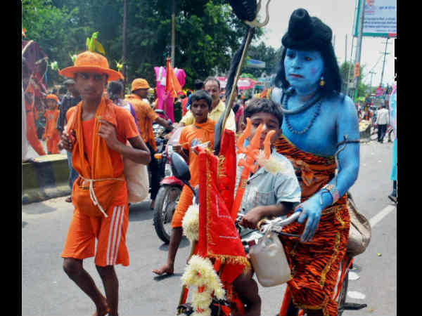 भगवान शिव के लिबाज़ में एक व्यक्ति साइकिल पर बच्चे को ले जाता हुआ। यह तस्वीर यूपी के मुरादाबाद की है।