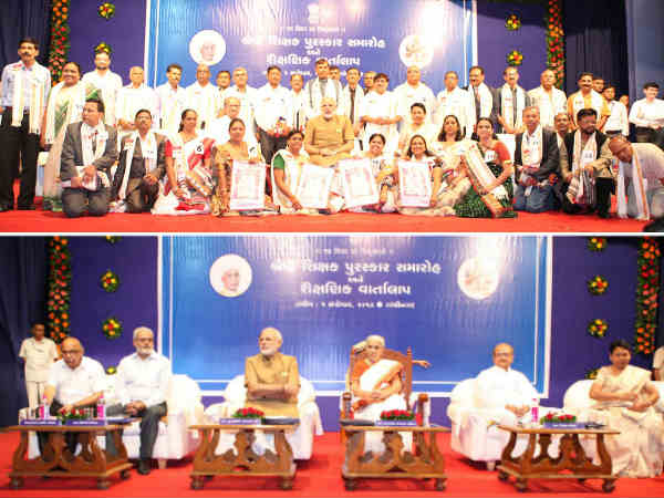 अहमदाबाद। गुजरात की राज्यपाल डॉ. कमला एवं मुख्यमंत्री नरेंद्र मोदी ने शिक्षक दिवस के गरिमापूर्ण अवसर पर गुरुवार को गुजरात के 34 शिक्षकों को श्रेष्ठ शिक्षक पारितोषिक से नवाजा।