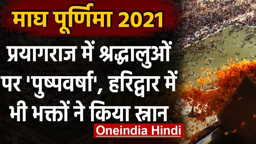 माघ पूर्णिमा आज: त्रिवेणी घाट पर श्रद्धालुओं के ऊपर प्रयागराज प्रशासन ने हेलीकॉप्टर से की पुष्प वर्षा