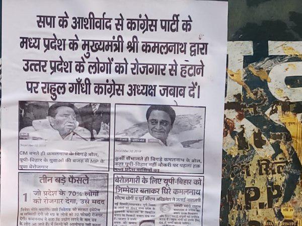 पोस्टर में लिखा गया- सपा के आशीर्वाद से कांग्रेस पार्टी के मध्यप्रदेश के मुख्यमंत्री श्री कमलनाथ द्वारा यूपी के लोगों को रोजगार से हटाने पर राहुल गांधी जवाब दें। पोस्टर में अखबारों की कटिंग भी लगी जिसमें सीएम कमलनाथ का वो बयान है जिसमें उन्होंने एमपी में बेरोजगारी के लिए यूपी बिहार के लोगों को जिम्मेदार बताया। अमेठी कस्बे के देवीपाटन मंदिर और सगरा तिराहे, गौरीगंज के कांग्रेस कार्यालय, कलेक्ट्रेट मोड़, एसपी ऑफिस मोड़ के साथ पूरे जिले में लगाए गए है।