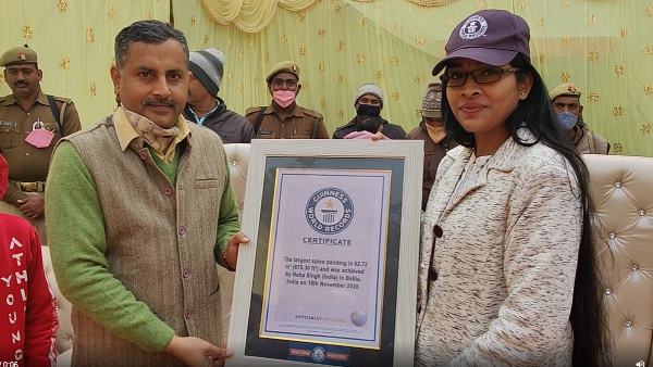 बलिया। उत्तर प्रदेश के बलिया में रहने वाली नेहा सिंह ने खनिज रंगों से 'भगवद्गीता' पर आधारित 'मोक्ष का पेड़' नामक पेटिंग बनाकर गिनीज वर्ल्ड रिकॉर्ड में अपना नाम दर्ज कराया है। नेहा ने घर पर ही खनिज रंगों से सबसे बड़ी पेंटिंग बनाई है। इसका साइज 62.72 स्कॉयर मीटर यानि 675.36 स्कॉयर फीट है। पेंटिंग जुलाई महीने में ही गिनीज के नियमों के अनुसार तैयार करके ऑनलाइन से सभी डाक्यूमेंट्स जमा कर चुके थे, लेकिन कोविड के चलते गिनीज से जवाब आने में चार महीने का समय लग गया। काशी हिंदू विश्वविद्यालय के 100 वर्षों में पहली बार विद्यार्थी का नाम 'गिनीज वर्ल्ड रिकॉर्ड' में दर्ज हुआ है। बलिया के डीएम हरि प्रताप शाही ने नेहा सिंह के घर आकर उन्हें बधाई दी और उन्हें सर्टिफिकेट दिया।