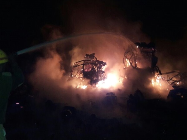 बेंगलुरू। कर्नाटक के चिकबल्लापुर जिला स्थित चिंतामनी गांव के पास उस वक्त दहशत पैदा हो गई जब वहां अचानक से 900 गैस सिलेंडरों में ब्लास्ट हो गया। ये सारे गैस 2 ट्रकों में भरे हुए थे। हालांकि इस घटना में किसी के भी मारे जाने की खबर नहीं है। इस आग के चलते 2 ट्रक और एक बोलेरो गाड़ी पूरी तरह से जलकर खाक हो गई। रिपोर्ट्स के अनुसार यह घटना रविवार रात (25 दिसंबर) को बैटरी में शॉर्ट सर्किट होने कारण हुई। आग लगने के थोड़ी देर बाद घटना स्थल पर दमकल की गाड़ियां पहुंची जिनकी मदद से हालात पर काबू पा लिया गया है।