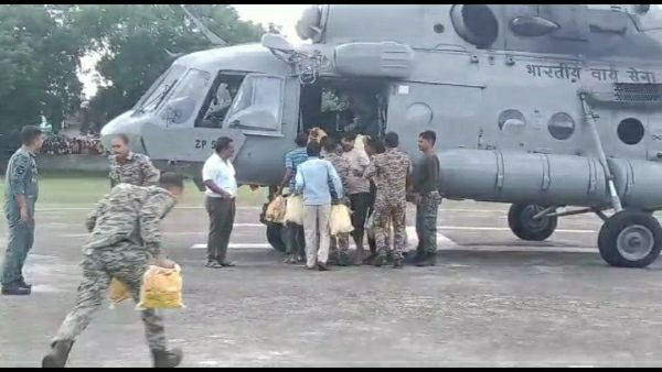 बाढ़ प्रभावित इलाकों में हेलीकॉप्टर से पहुंचाया गया सूखा राशन