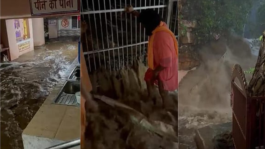 आश्रम से लगा हुआ झरना बारिश के चलते रौेद्र हो गया। झरने का बहाव इतना तेज हो गया कि देखते ही देखते आश्रम का कुंड लबालब हो गया और गुफा के रास्ते पानी आश्रम के अंदर समा गया।