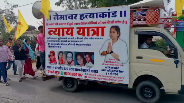 दरअसल, देवास जिले के नेमावर के आदिवासी परिवार में मां, दो बहन व ममेरे भाई और ममेरे बहन की हत्या कर शव दफनाने के मामले में बेटी भारती कास्डे ने न्याय यात्रा निकालीी। एक जनवरी को नेमावर से शुरू हुई यात्रा 11वें दिन भोपाल पहुंची।