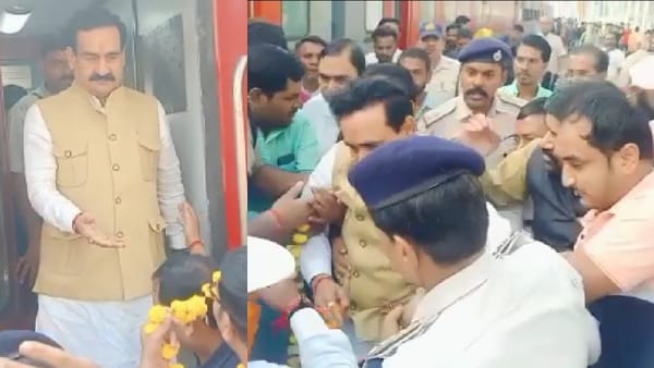VIDEO: मैहर रेलवे स्टेशन में भीड़ के धक्कों से गिरते-गिरते बचे मंत्री नरोत्तम मिश्रा