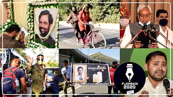 बिहार। साल 2020 बिहार के लिए घटनाओं से भरा रहा। इस साल कोरोना वायरस से फैली महामारी की वजह से लगे लॉकडाउन में देशभर में रोजगार के लिए फैले लाखों बिहार वासियों को कष्ट झेलकर प्रदेश वापस आना पड़ा। एक्टर सोनू सूद ने बिहार के प्रवासियों को घर लौटने में जो मदद की, उसके लिए वे प्रदेश के लोगों के लिए रियल हीरो रहे। इसी दौरान बेटी ज्योति साइकिल चलाते हुए पिता को गुरुग्राम से बिहार के दरभंगा स्थित घर ले आई। जून में बिहार निवासी एक्टर सुशांत सिंह राजपूत की रहस्यमयी मौत ने चुनावी राजनीति को गरमा दिया। मुख्यमंत्री नीतीश कुमार के 15 साल के शासनकाल के बाद इस बार के चुनाव में उनके सामने फिर से सत्ता में आने की बड़ी चुनौती थी जिसमें वे सफल हुए लेकिन सीटों के मामले में सहयोगी पार्टी भाजपा आगे निकल गई। चुनाव में राजद नेता तेजस्वी यादव और लोजपा नेता चिराग पासवान के युवा नेतृत्व की भी परीक्षा हुई। लंदन से पढ़कर आईं पुष्पम प्रिया चौधरी अपनी पार्टी और चुनाव के दौरान बिहार में दौरों को लेकर सोशल मीडिया पर चर्चा का केंद्र बनीं। इस साल बिहार ने रघुवंश प्रसाद सिंह, राम विलास पासवान सरीखे दिग्गज नेताओं को खो दिया। आइए साल 2020 में बिहार में हुई बड़ी घटनाओं पर एक नजर डालते हैं।
