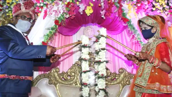 सोशल डिस्टेंस वाली शादी: दूल्हे-दुल्हन ने एक-दूजे को डंडे से माला पहनाईं, ताकि वायरस का खतरा न हो