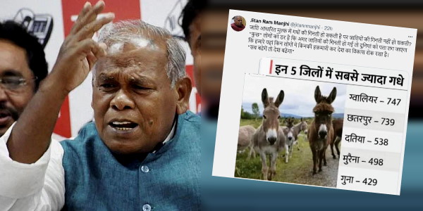पटना। बिहार में जातीय जनगणना कराने से जुड़े विवाद में पूर्व मुख्यमंत्री जीतनराम मांझी भी कूद पड़े। उन्होंने कहा कि, जाति आधारित मुल्क में गधों की गिनती हो सकती है तो क्या जातियों की गिनती नहीं हो सकती? मांझी ने यह बात ट्विटर के जरिए कही। ट्वीट में उन्होंने गधों की गणना से जुड़ी तस्वीर भी पोस्ट की। जिसमें दिखाया गया था कि गधे कहां ज्यादा हैं।