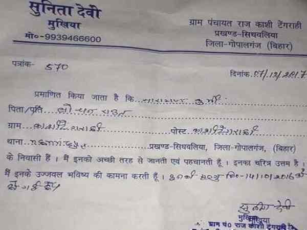 7 दिसंबर 2017 को मुखिया के दस्तखत और मुहर से जारी यह प्रमाण पत्र वायरल हो रहा है। मोहम्मदपुर थाना क्षेत्र काशी टेंगराही निवासी नारायण कुर्मी की 14 अक्टूबर 2016 को हो गयी थी। मृतक के पिता का नाम लोचन राउत है। उन्होंने अपने बेटे के मृत्यु प्रमाण पत्र के लिए पंचायत की मुखिया सुनीता देवी से संपर्क किया जिसके बाद सिधवलिया प्रखंड के काशी टेंगराही पंचायत की मुखिया सुनीता देवी द्वारा जारी पत्रांक संख्या 570 में मृतक नारायण कुर्मी का मृत्यु प्रमाण पत्र बनाया गया।